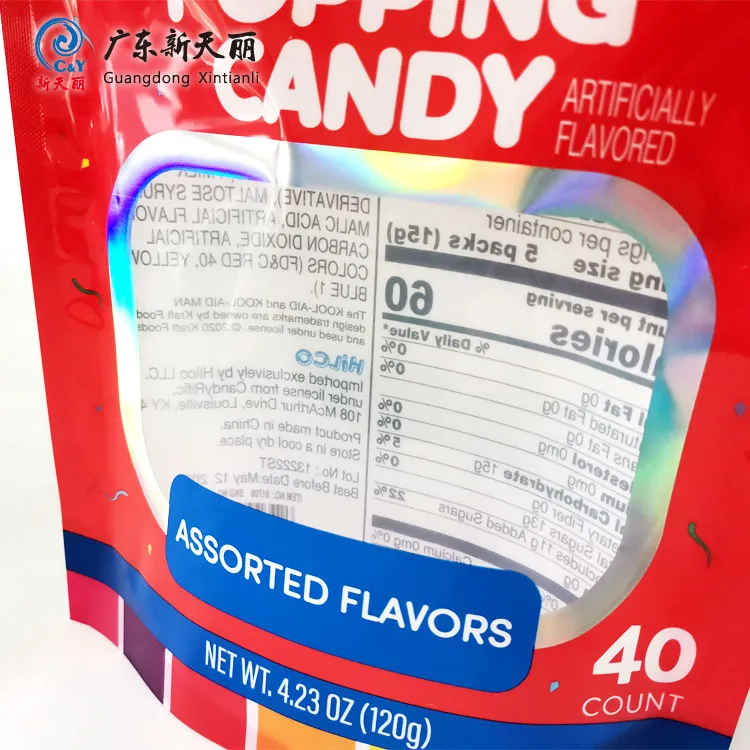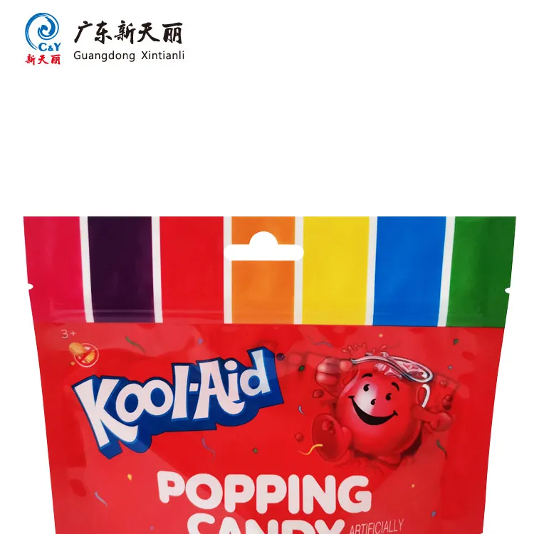 Welcome to order custom printed candy bags. Our custom popping candy packaging bags wholesale come with an easy-tear design, a clear window design, zipper design and supermarket holes, which support customized printing.